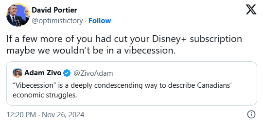 一位 X 用户写道:“如果你们中再多几个人取消迪士尼+订阅,也许我们就不会陷入经济衰退。”他讽刺方慧兰之前建议加拿大人取消媒体服务订阅,以降低不断上涨的生活成本。