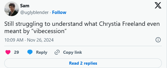 “[方慧兰]在对那些艰难度日的人说,‘这一切只是你们的错觉’。也许他们觉得生活艰难,但这不过是‘一种氛围’罢了。[加拿大的]财政部长在为加拿大人洗脑。”Vuong在X上表示。
