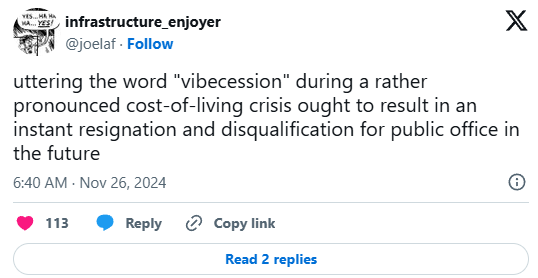 “在一个明显的生活成本危机期间说出‘氛围衰退’这个词,应该导致立刻辞职,并且永远无法再担任公职。”一位网友写道。