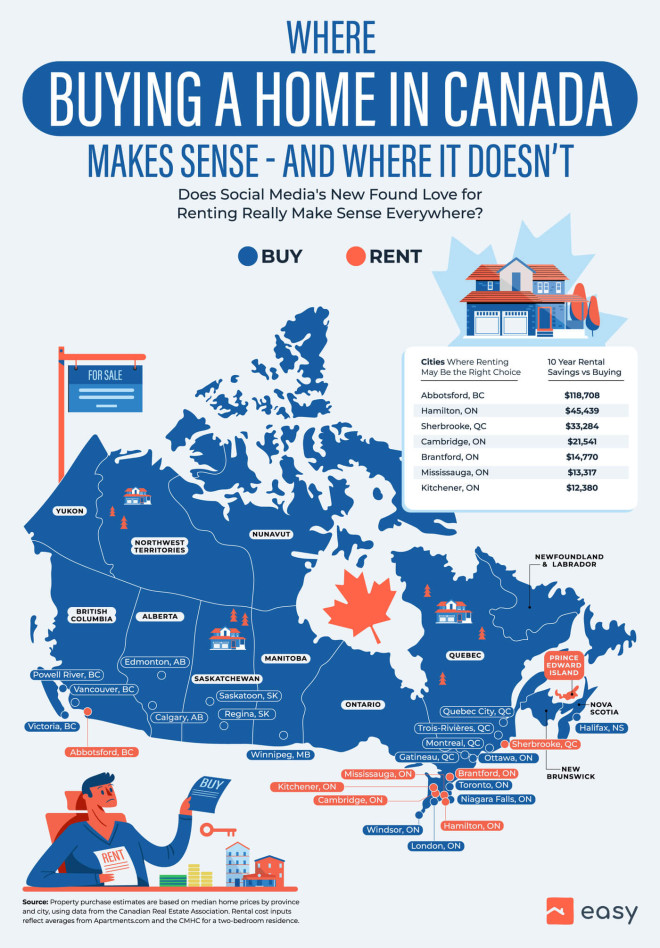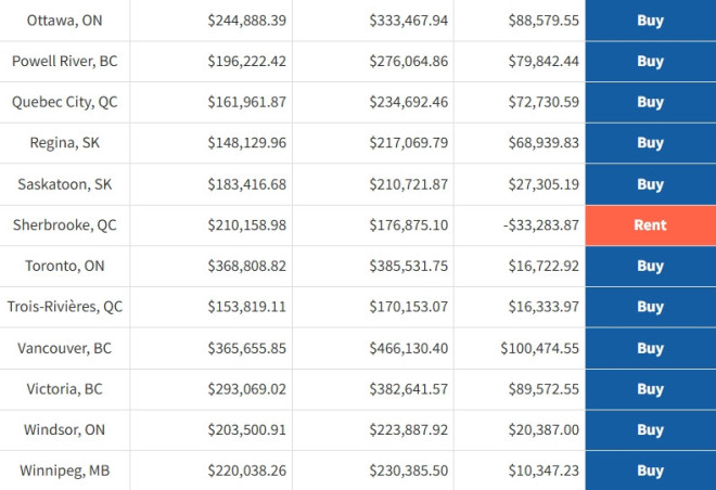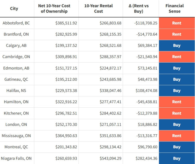 结果显示,在加拿大25个最大城市中,有7个城市在10年内租房比买房更省钱。