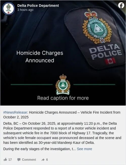 2025年11月6日,受害人的妹夫,一名24岁的三角洲男子被捕。 第二天,根据《刑法典》第182(b)条,他被指控侮辱遗骸。