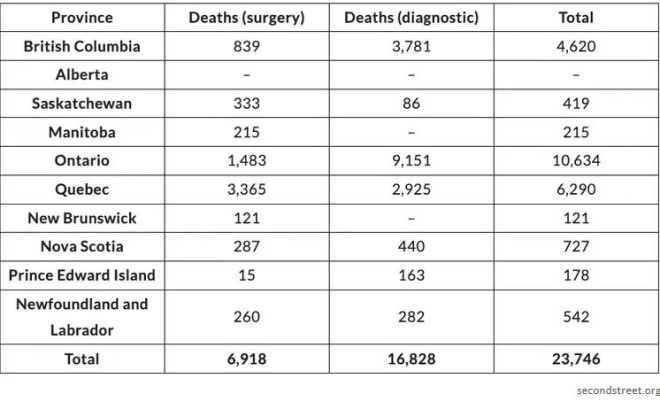 非营利政策研究机构 SecondStreet.org 指出,从 2024 年 4 月 1 日至 2025 年 3 月 31 日期间,加拿大至少有 23.746 名患者在等待手术或诊断扫描时死亡。