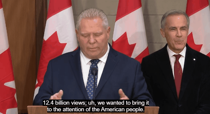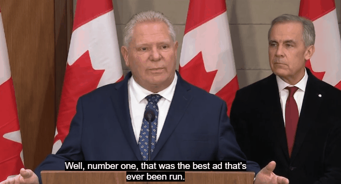 最明显的例子,莫过于福特政府曾斥资7.500万加元,制作并投放了一则广告,显示美国前总统里根(Ronald Reagan) 出镜,讲述关税政策的危害。