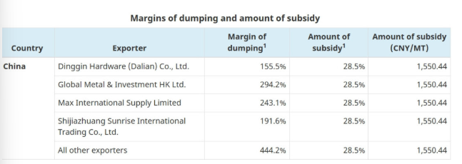 根据最终裁定,不同中国出口商的倾销幅度差异较大,最高可达444.2%;所有涉案产品的补贴幅度统一认定为28.5%,折合约1,550.44 元人民币/吨。