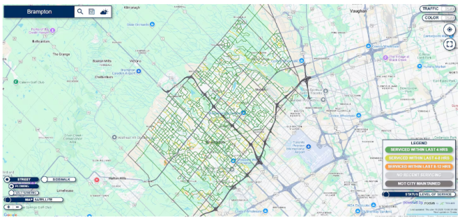 多数道路在 6 小时内完成清理,但东部和北部部分区域仍超过 24 小时未被覆盖。人行道清理进度不均,有的在 2 小时内完成,有的超过 12 小时。